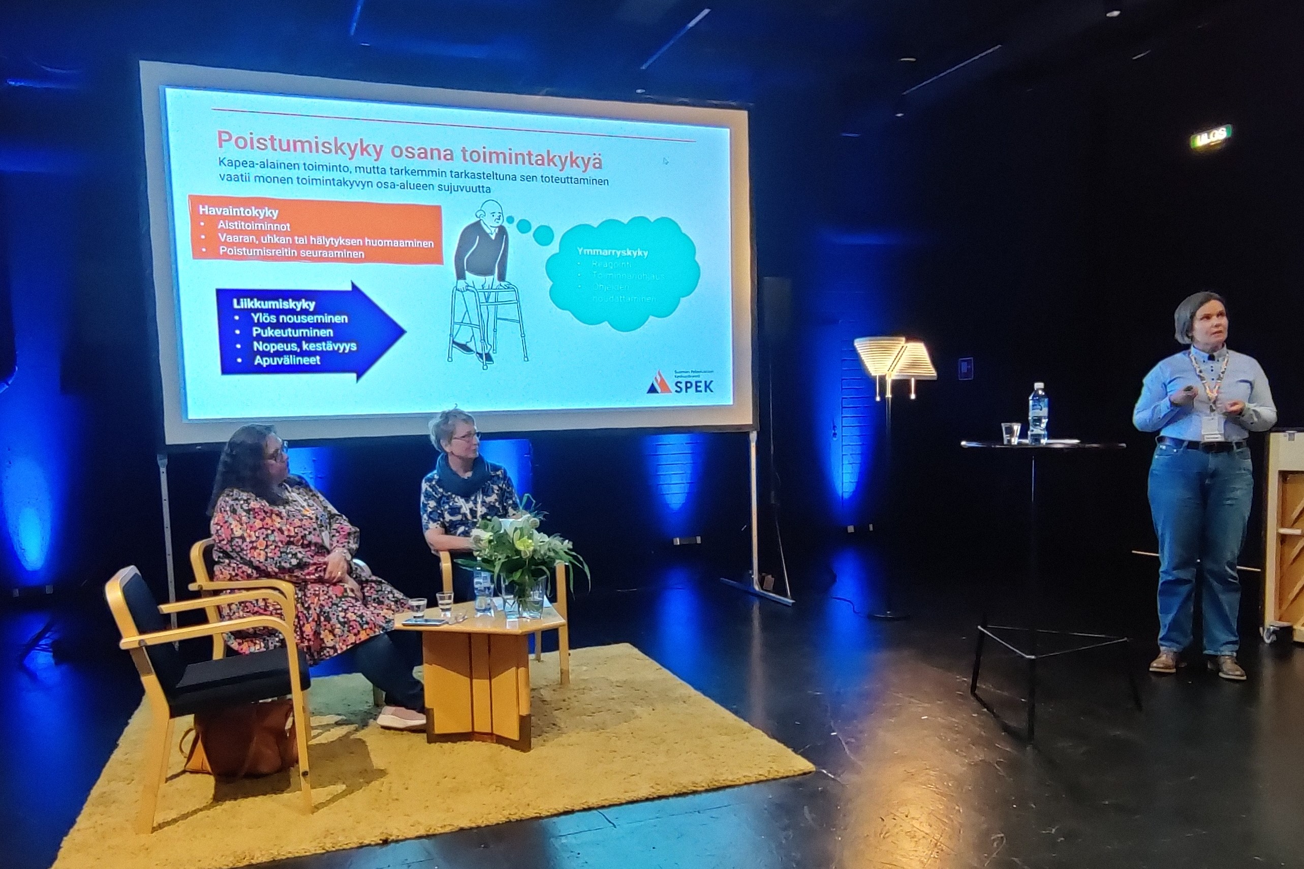 Projektikoordinaattori Suvi Fried Suomen Pelastusalan Keskusjärjestöstä kertoi erilaisista iäkkäiden kohtaamista riskeistä ja niihin varautumisesta monin työvälinein. Yksinasuvien tai toimintakyvyn muutoksen tilanteessa kodin tarkistuslistat tai asuinalueen turvallisuuskävely auttaa hahmottamaan iäkkään ihmisen yksilöllisiä tarpeita sekä tuottamaan turvallisuutta parantavia ratkaisuja.